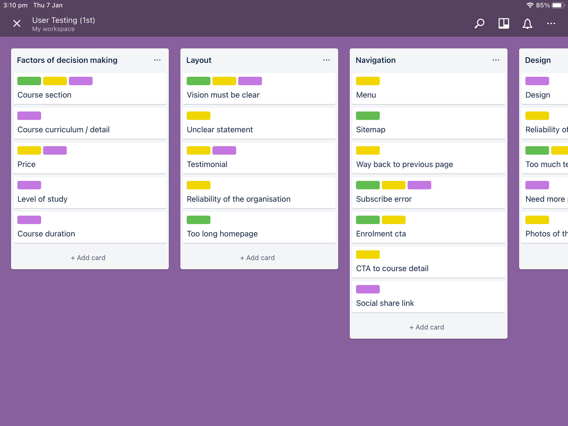 Affinity board of usability testing